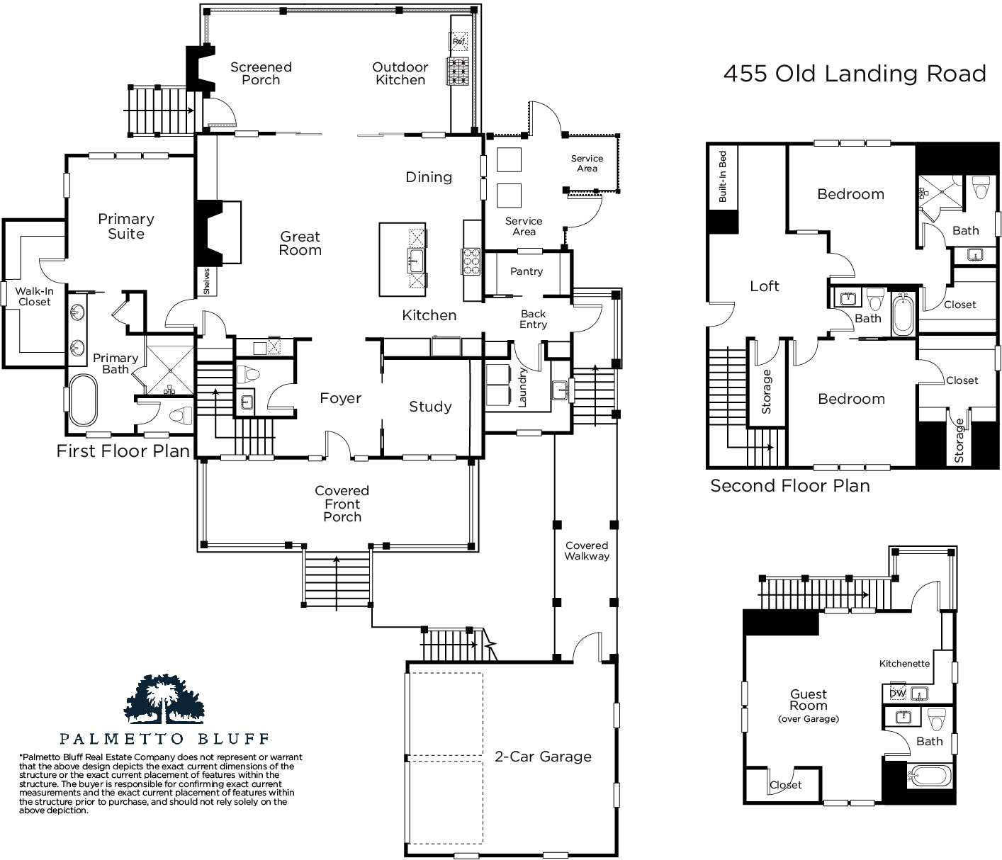 The primary suite, located on the main floor features a trio of tall, transomed windows and a vaulted ceiling with exposed beams. Its ensuite bath offers dual vanities, walk-in shower, soaking tub, and private WC. Upstairs, two ensuite guest rooms surround a loft with built-in bunk bed. A one-bedroom guest suite with kitchenette is located over the two-car garage.